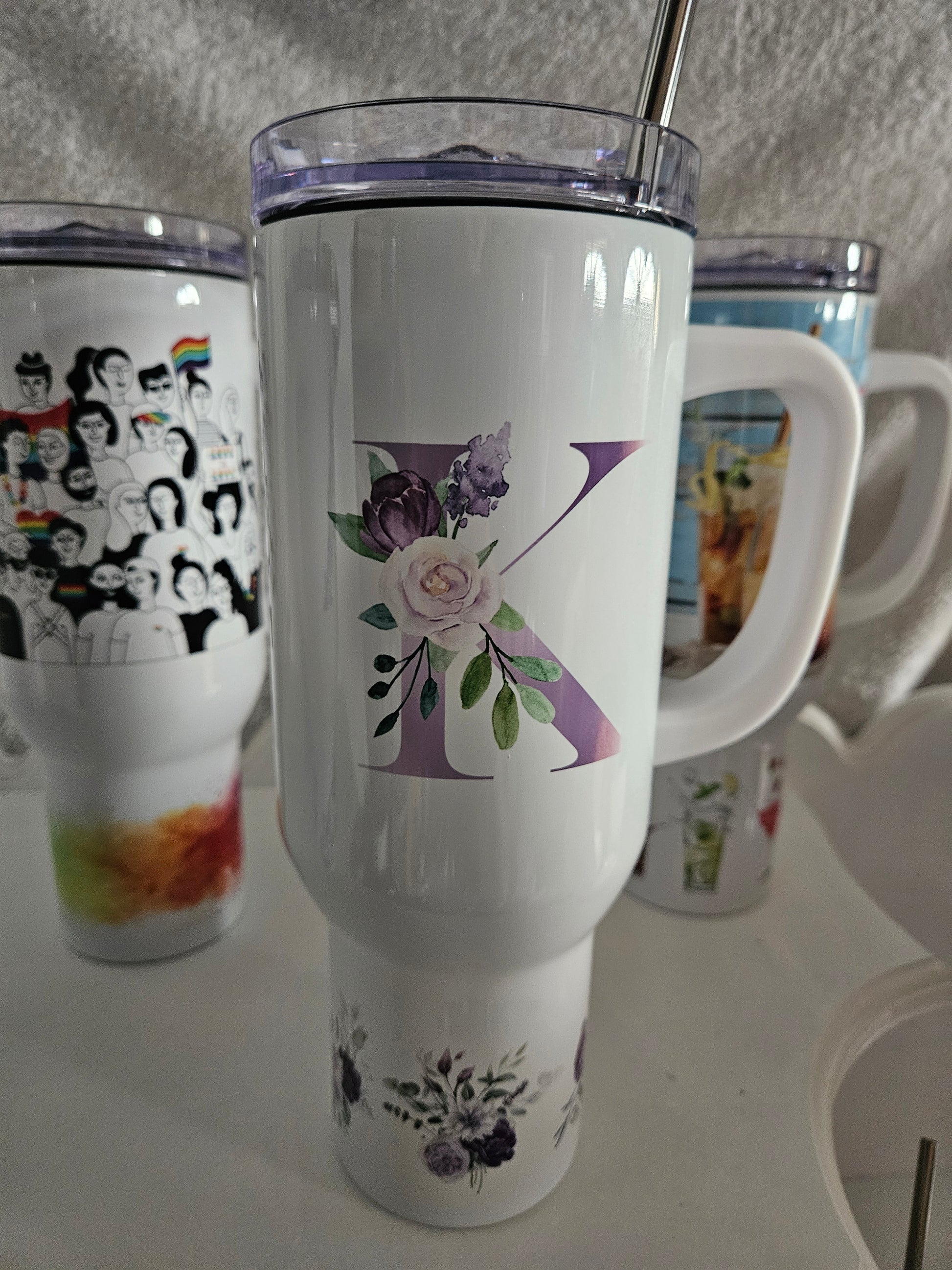 Preprinted with the initial of your choice and lilac and purple flowers around the base.