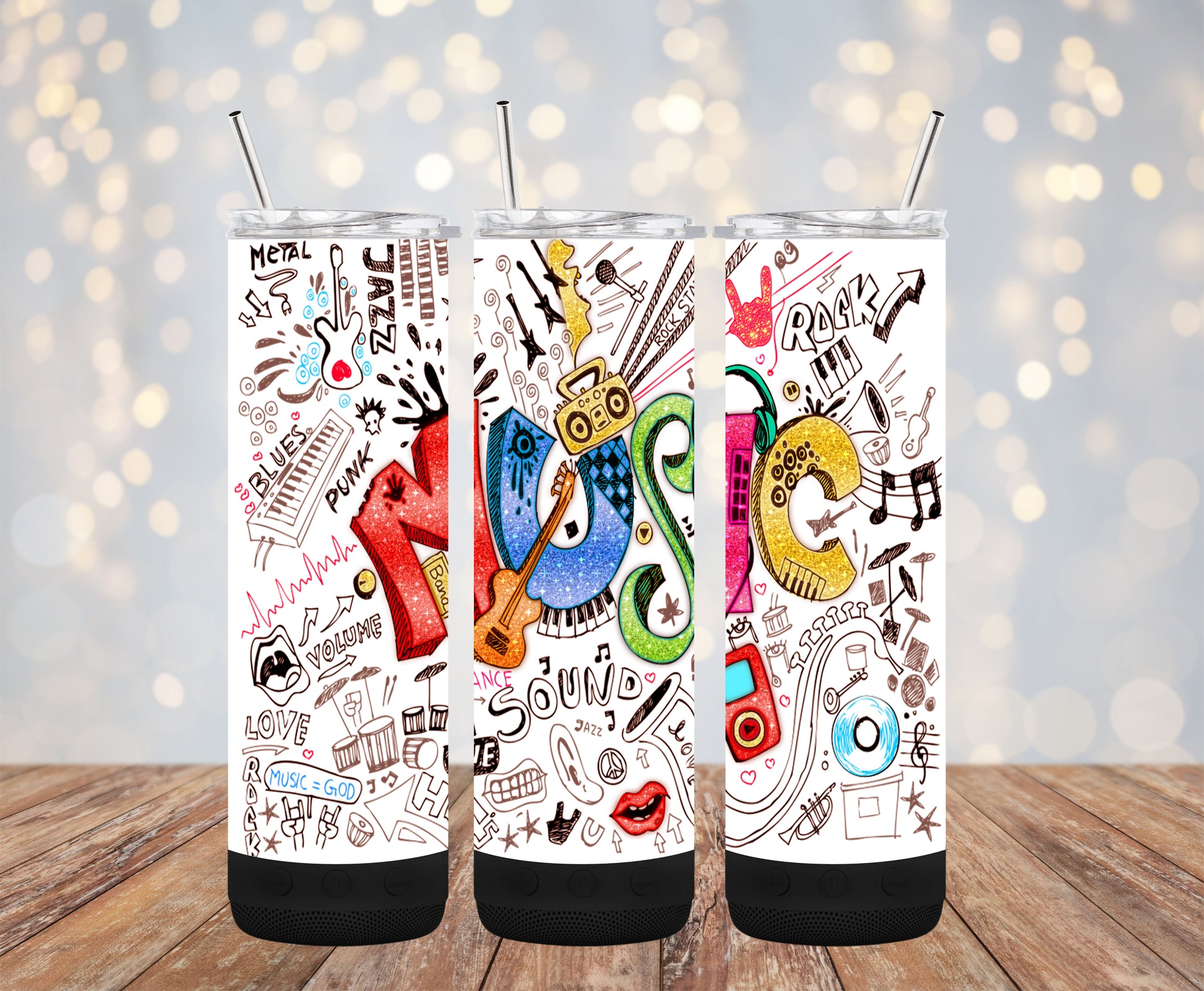 Complete with bluetooth speaker on the bottom. Speaker is removable for washing the tumbler. The tumbler comes with straw, clear plastic sealable lid and lead for charging the speaker.